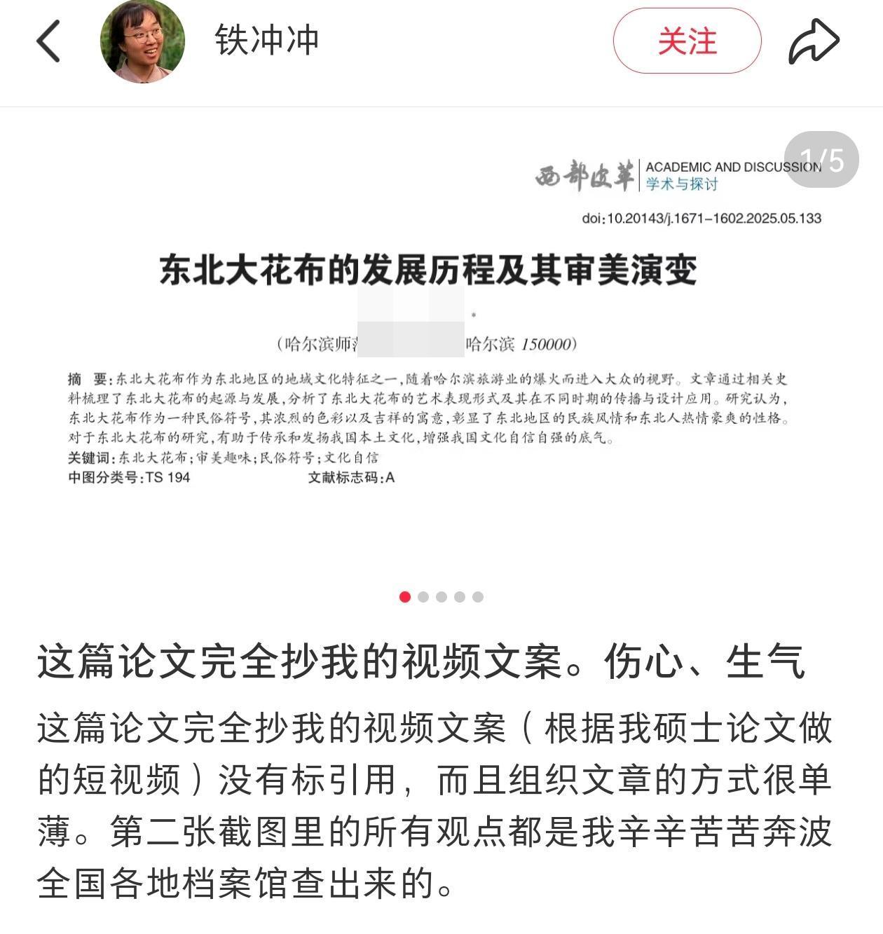 前段时刻,铁冲冲预备将该篇论文放上知网,就随手检索了关键词,没想到在知网上有一篇类似度极高的论文,名为《东北大花布的开展前史及其审美演化》。铁冲冲还发现,这篇论文疑似抄袭了自己的短视频。“尤其是其间有一段的一切观念,都是我辛辛苦苦奔走全国各地档案馆查出来的。”记者查询该篇论文看到,铁冲冲说到的被抄袭阶段,主要是关于我国东北大花布自行设计的探究进程。
